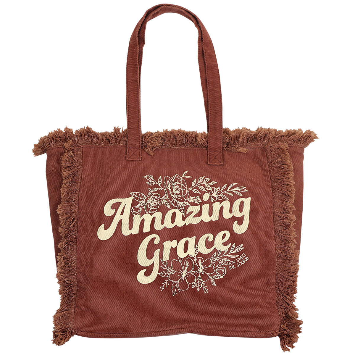 This durable fringed canvas Amazing Grace tote bag lets you carry a message of faith with you wherever you go! A removable bottom plate adds structure and shape. This pretty + practical tote bag includes two inner pockets—one zippered, and one open for easy access to your phone and keys.