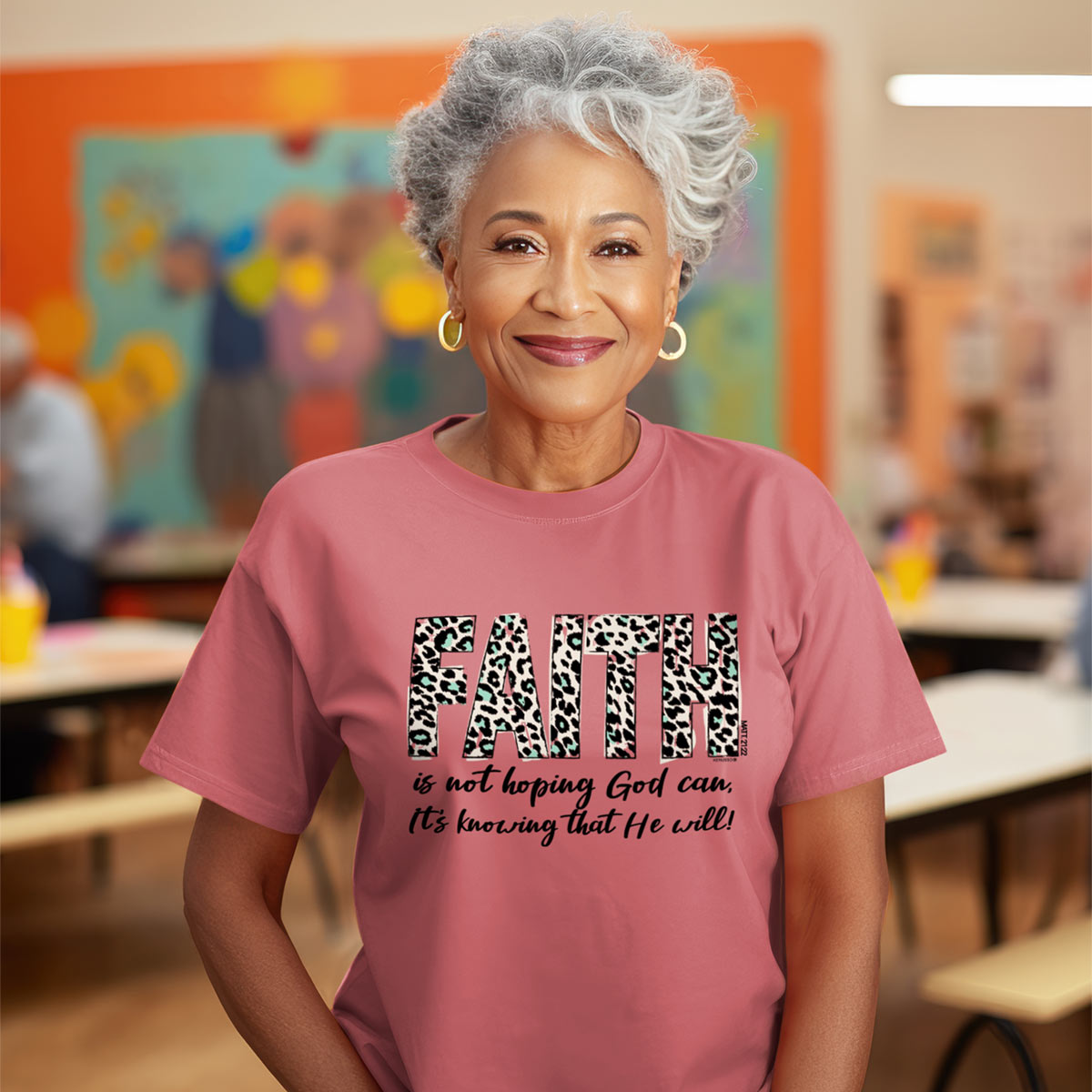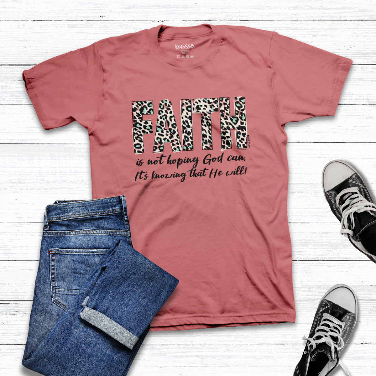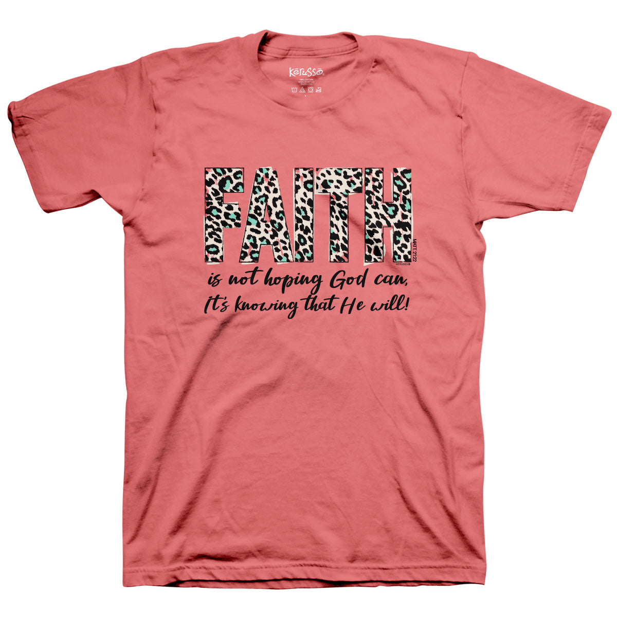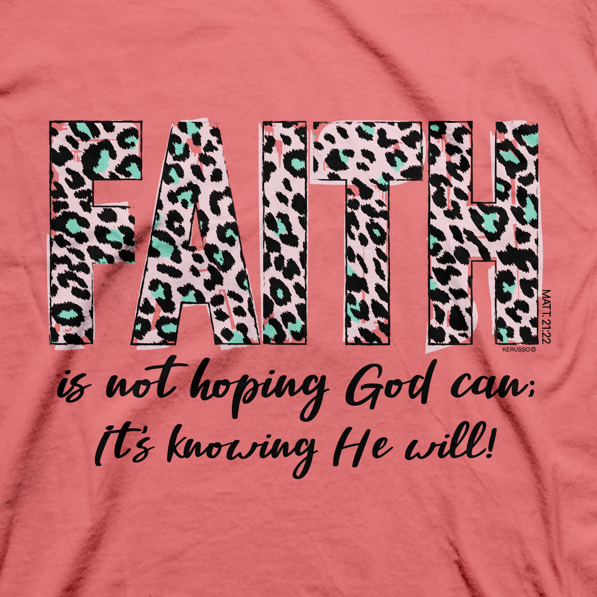 Stand strong in your faith in Jesus when you wear this cool “Faith Leopard” T-shirt by Kerusso® in Sorbet. You can place your hope in the Lord knowing He’s got this, whatever you face. No wimpy faith here—just a steadfast trust that God keeps His promises.